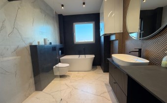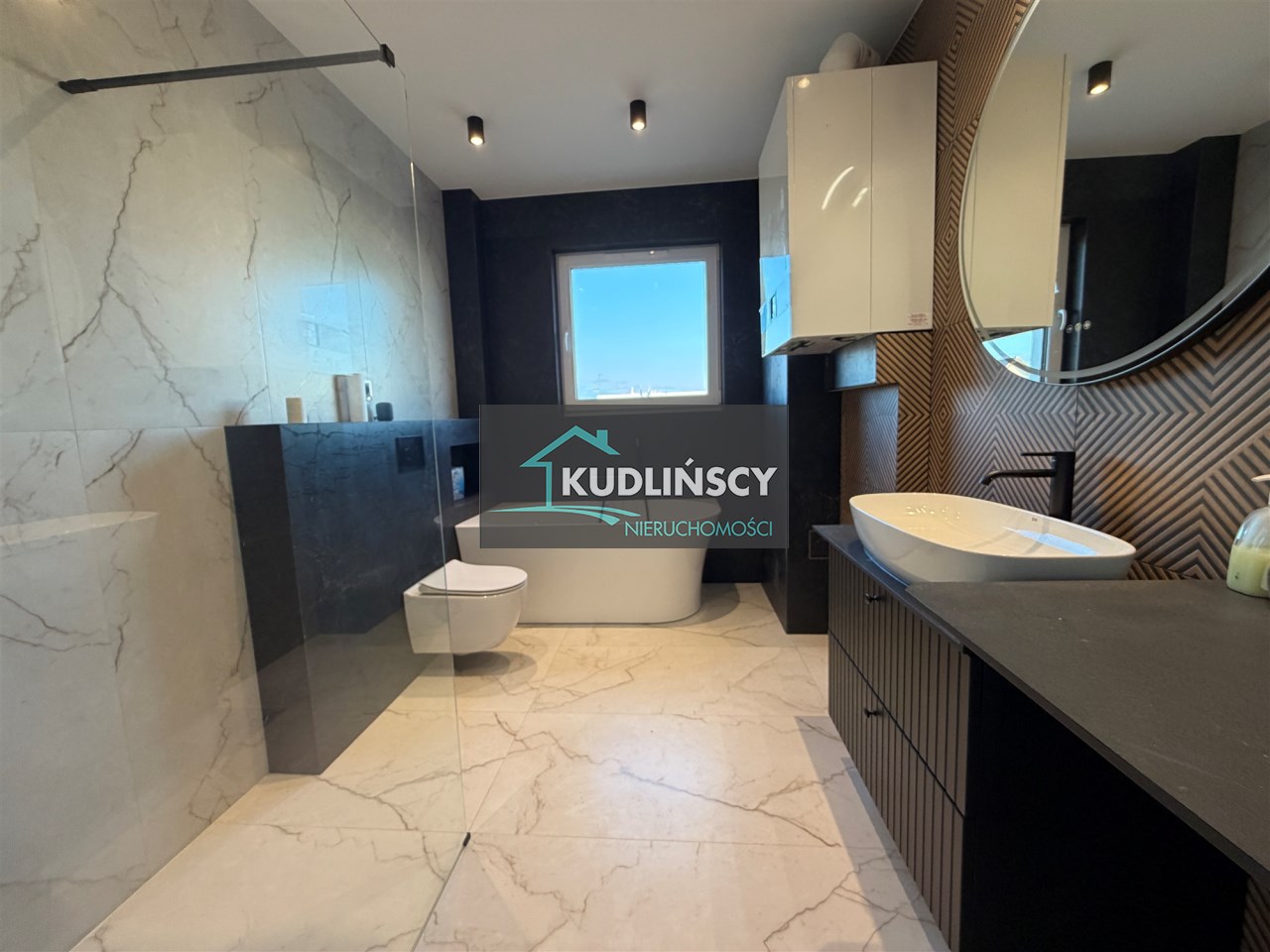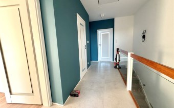 Piętro : 4 sypialnie ( podłogi panele), łazienka z kabina i wanną ( glazura i terakota)