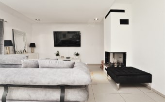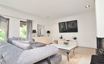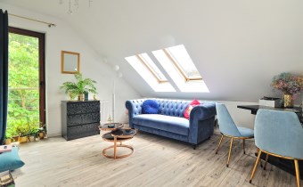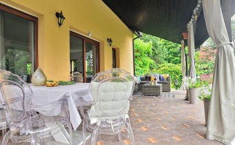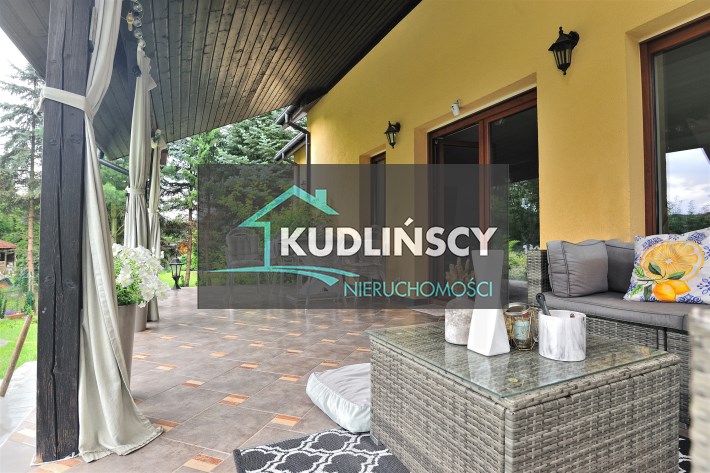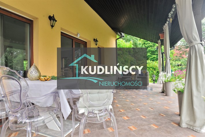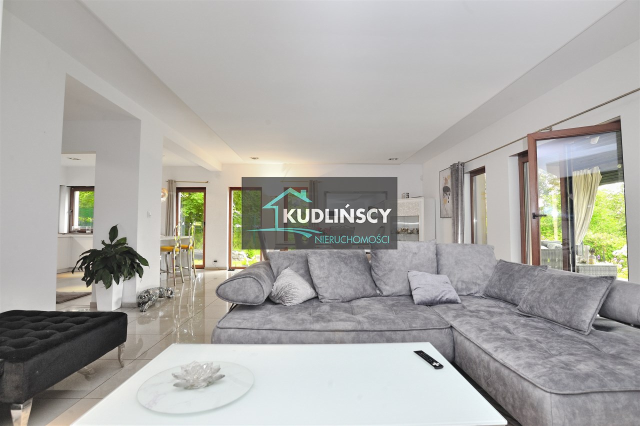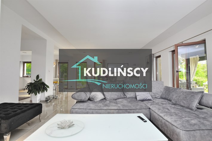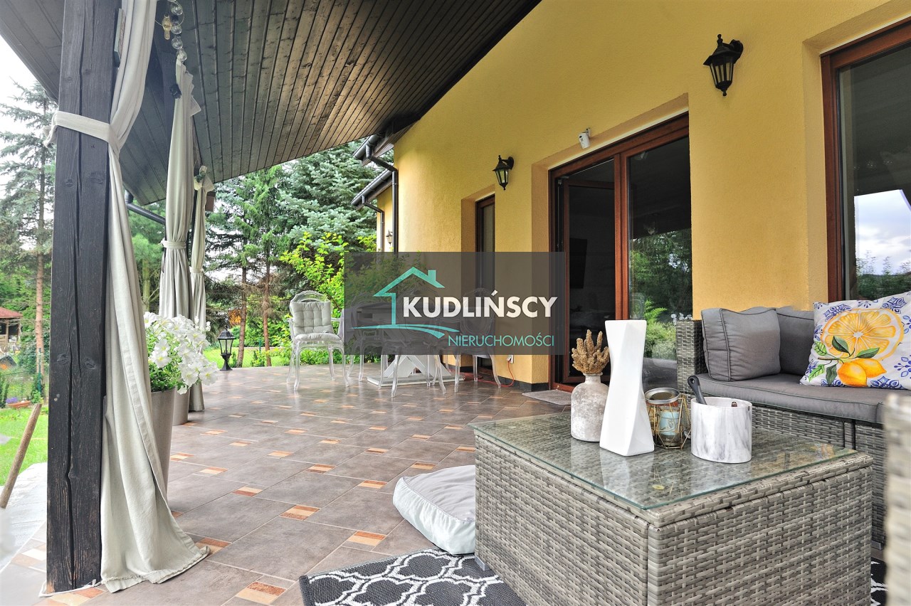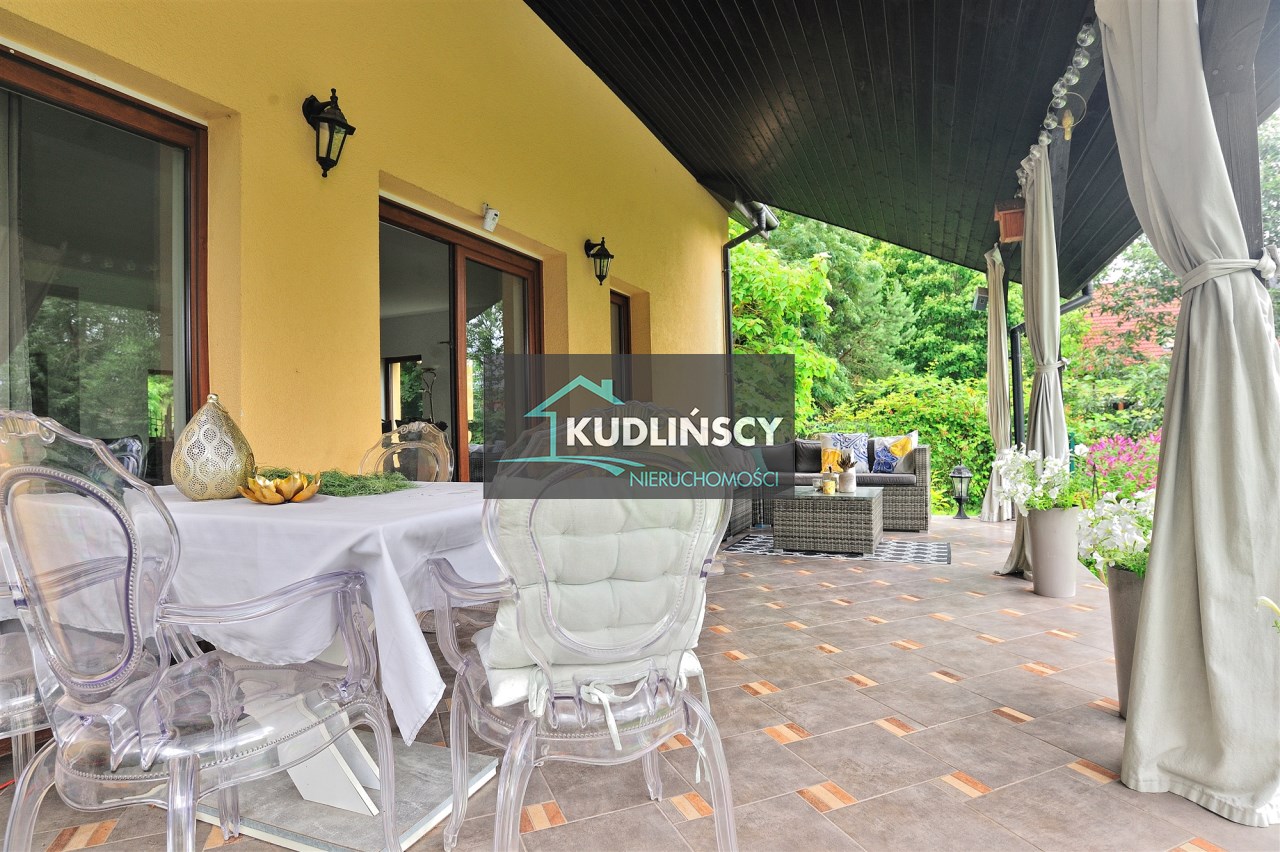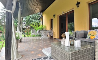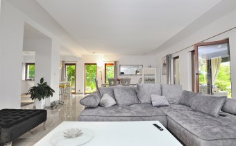 Przestronny, jasny salon z wyjściem na zadaszony taras od strony południowej