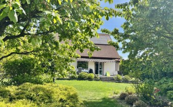 -Parter: salon z kuchnią, sypialnia, WC, kotłownia z pokojem/pracownią i WC, garaż. Przy garażu dodatkowo wiata z ładowarką do samochodów elektrycznych. Z salony wyjście na duży taras i ogród pełen zieleni, a także miejsca do zabaw dla dzieci;
