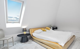 Pietro: sypialnia z oknem na ogród i garderobą, pokoj, zagospodarowany hol w z biblioteką i drugim biurem, oraz pokój kąpielowy.