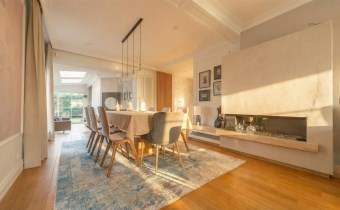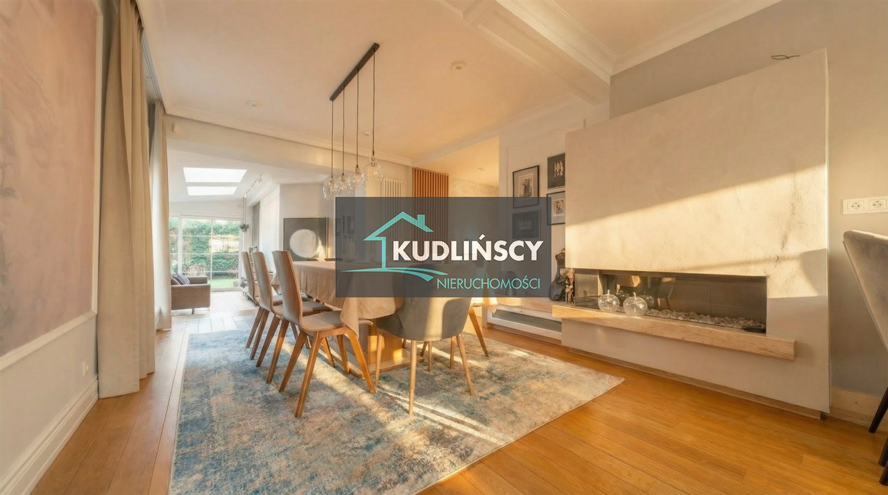 - otwarta jadalnia z dużym stołem i kominkiem
