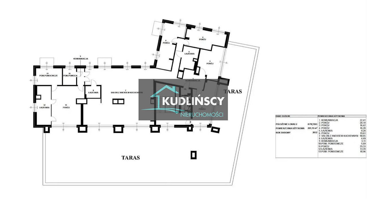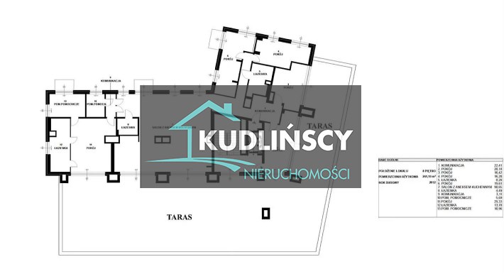Powierzchnia mieszkalna 261 m2, dodatkowo taras 319 m2, 3 balkony o pow. 2,73 m2 każdy, 3 miejsca postojowe plus 2 pomieszczenia gospodarcze.
