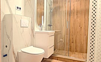 łazienka po remoncie, wyposażona w kabinę prysznicową