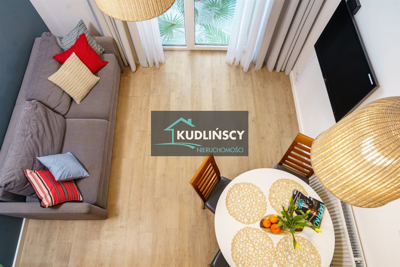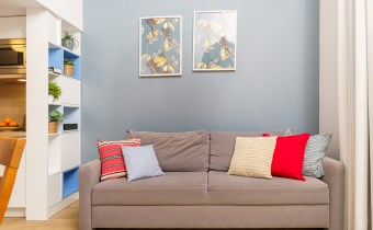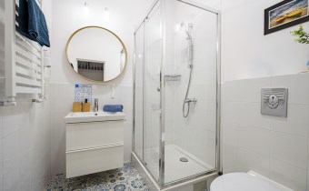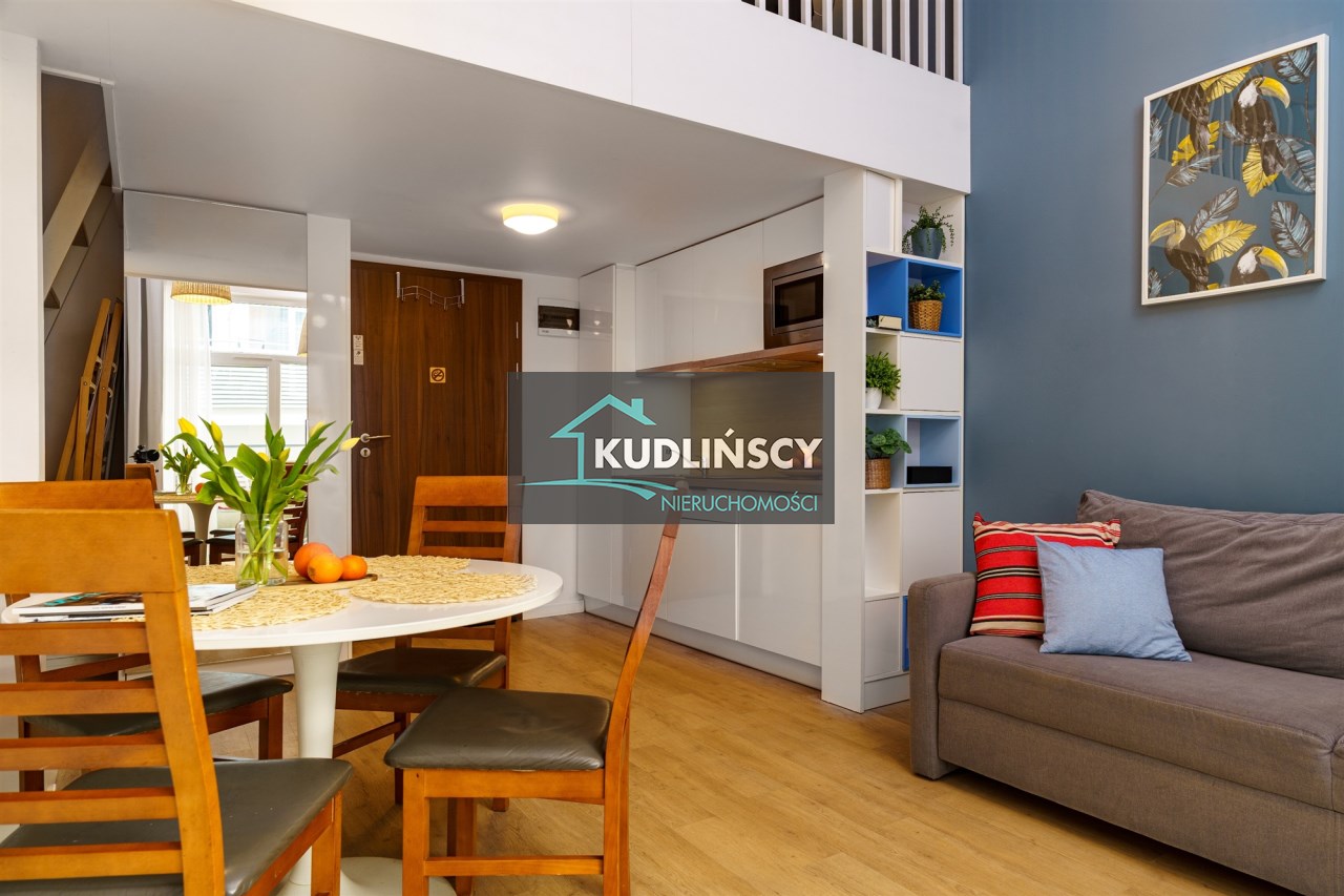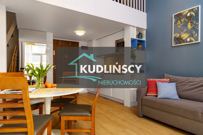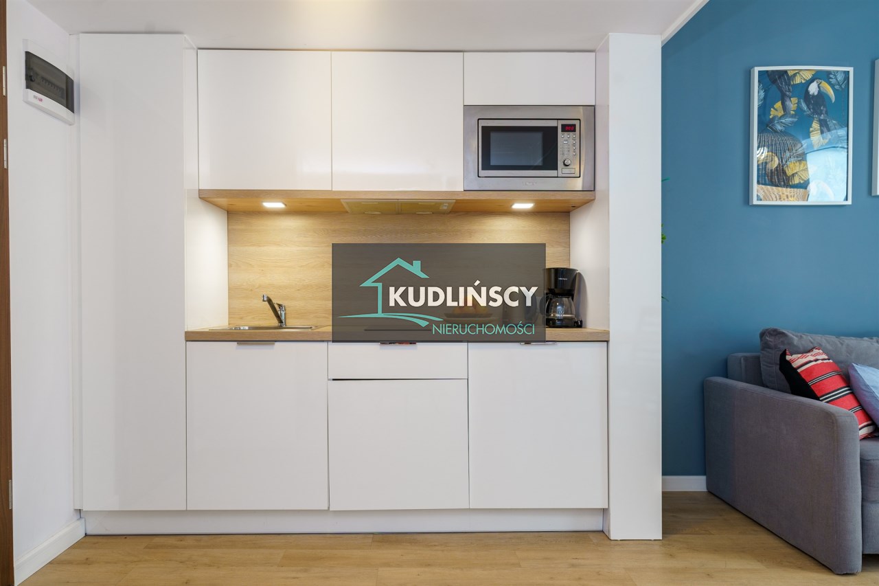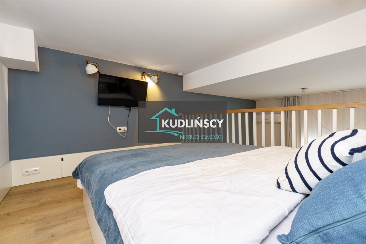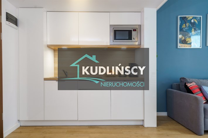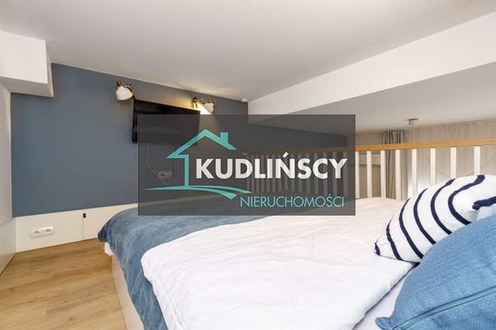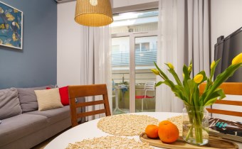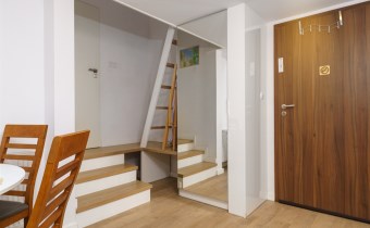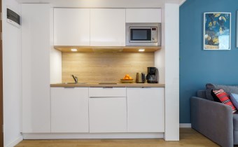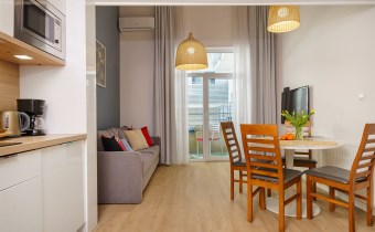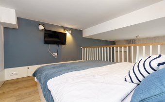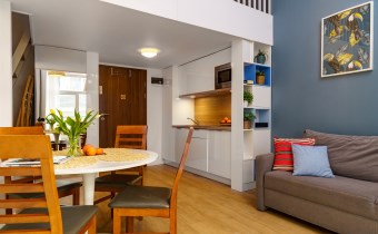 Funkcjonalne studio z antresolą zostało zaprojektowane z myślą o maksymalnym komforcie gości. Na antresoli znajduje się dwuosobowe łóżko oraz telewizor, natomiast w części dziennej – rozkładana sofa, stół z krzesłami oraz drugi telewizor. Lokal pomieści 4 osoby, co znacząco zwiększa jego potencjał najmu. Do dyspozycji jest również w pełni wyposażony aneks kuchenny (lodówka, płyta kuchenna, pochłaniacz i kuchenka mikrofalowa). Całość uzupełnia balkon z bocznym widokiem na morze.