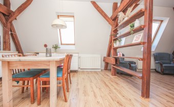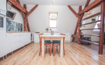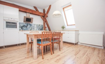- Przestronny salon z w pełni wyposażonym w sprzęty AGD aneksem  kuchennym i jadalnią o powierzchni ponad 27m