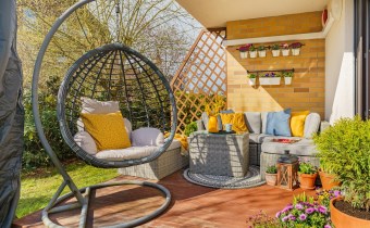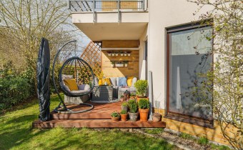 * Strefa relaksu gotowa od pierwszego dnia – drewniany taras z meblami – poranna kawa, kolacja latem czy spokojne popołudnie bez wychodzenia z domu