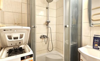 Wyposażenie łazienki kabina prysznicowa, lustro, pralka, prysznic, umywalka