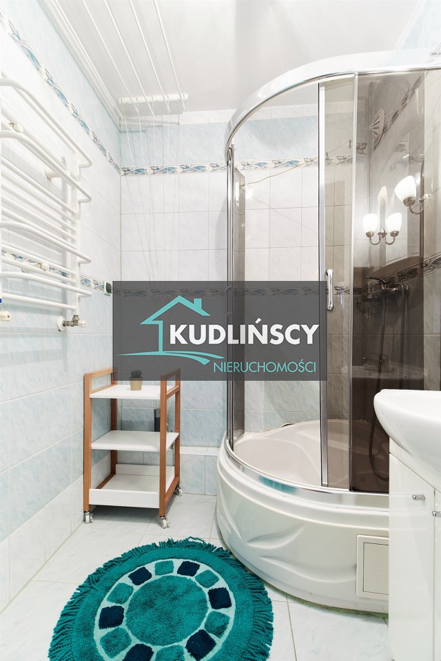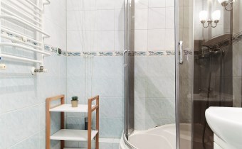 • łazienka z prysznicem + osobne WC (wyposażona w pralkę)
