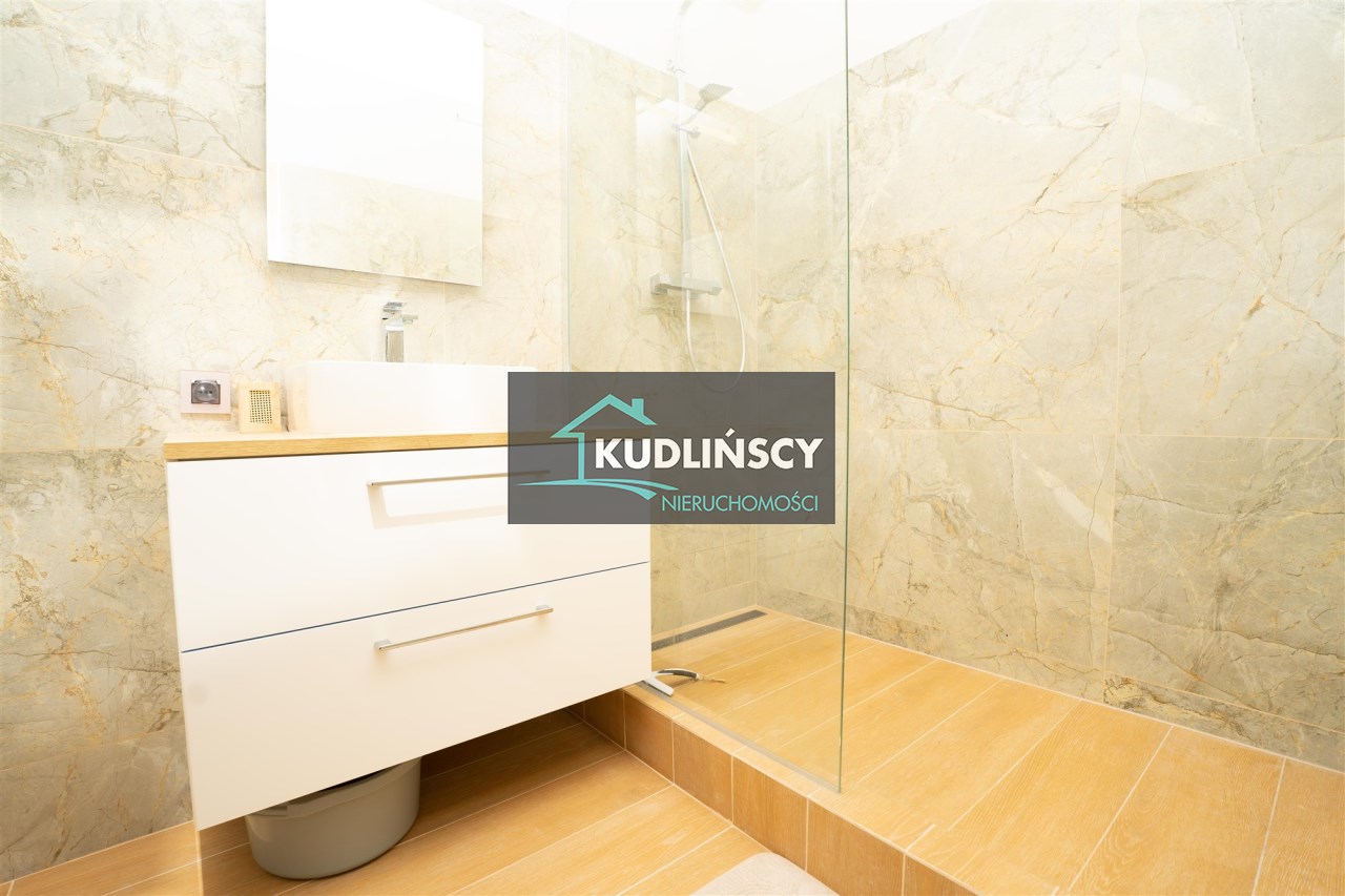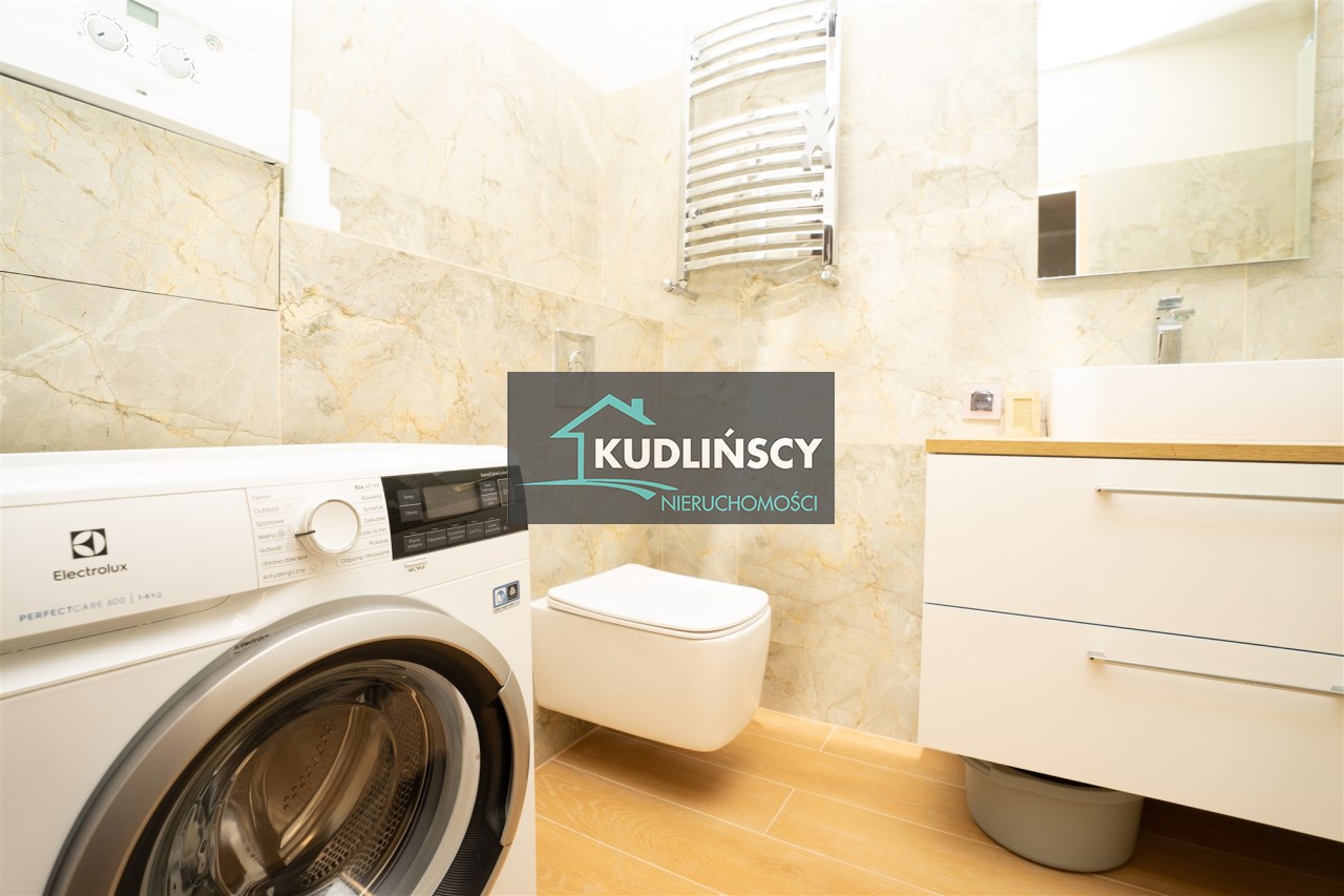 łazienka z kabiną prysznicową, na wyposażeniu pralka.