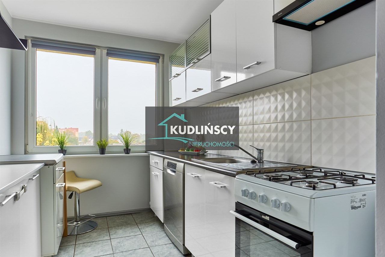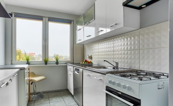 W kuchni znajdziemy meble, kuchenkę gazową, lodówkę, zmywarkę