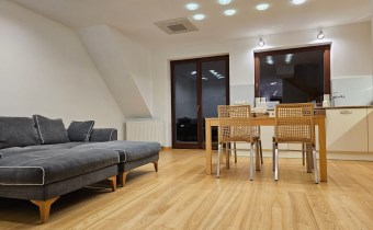 Przestronny salon z kinem domowym, kuchnia z jadalnią, wyposażona łazienka.