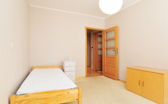 - Sypialnia (14m2) od strony wschodniej z dwoma oknami i widokiem na ogród przynależny do mieszkania. Pokój idealny dla 2 dzieci. Na podłodze wykładzina podłogowa. Łóżko 200x80. Szafki. Dużo biurko dla 2 osób.